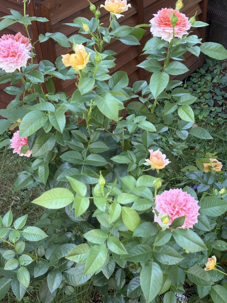この暑さの中、バラはいっぱい花を咲かせています。