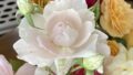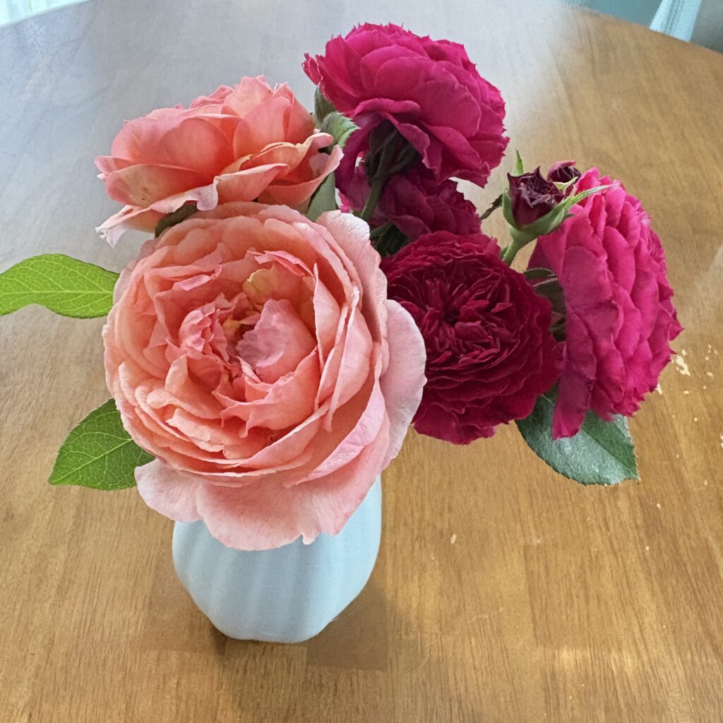 次々に咲くバラのおかげでテーブルの上はいつも花がいっぱいです。