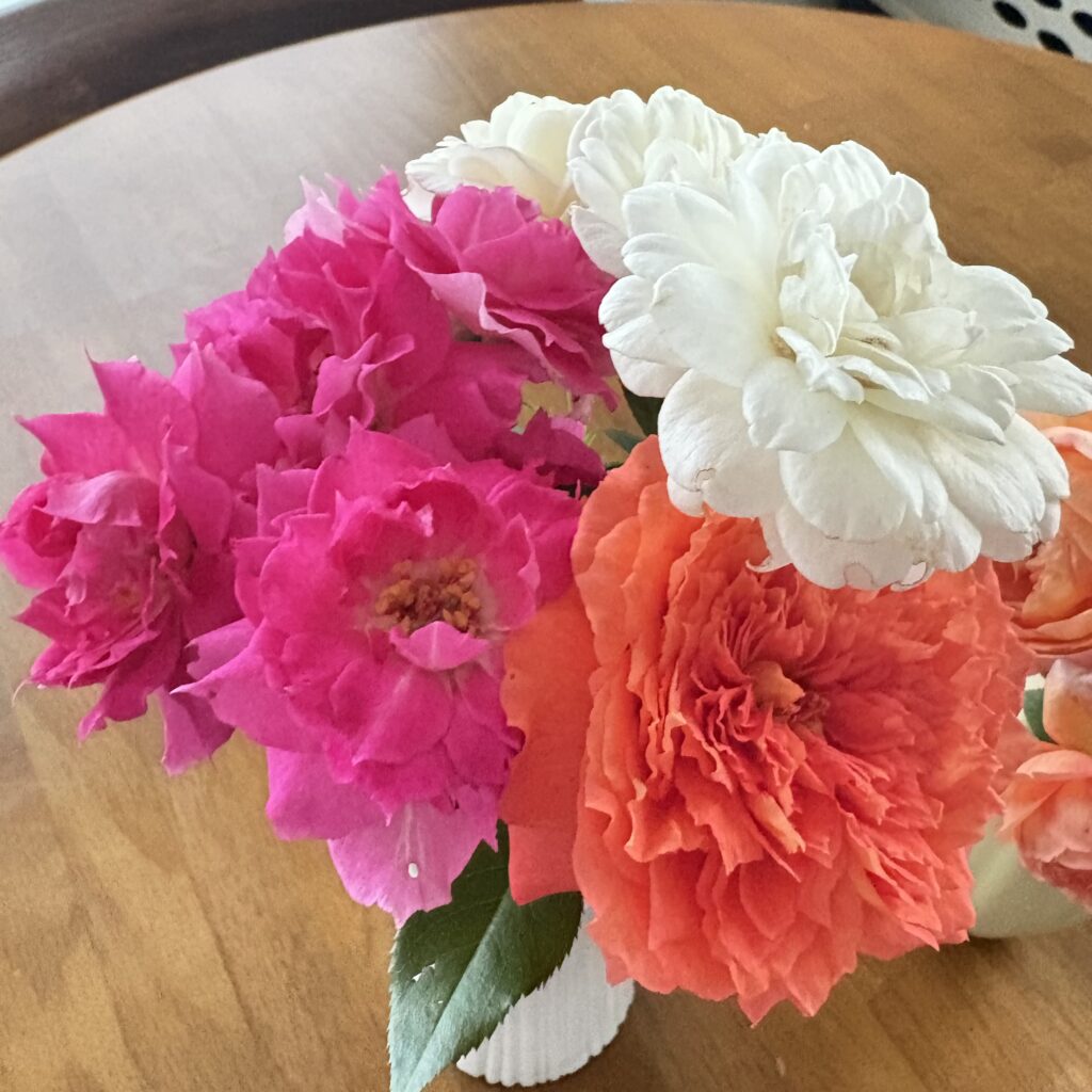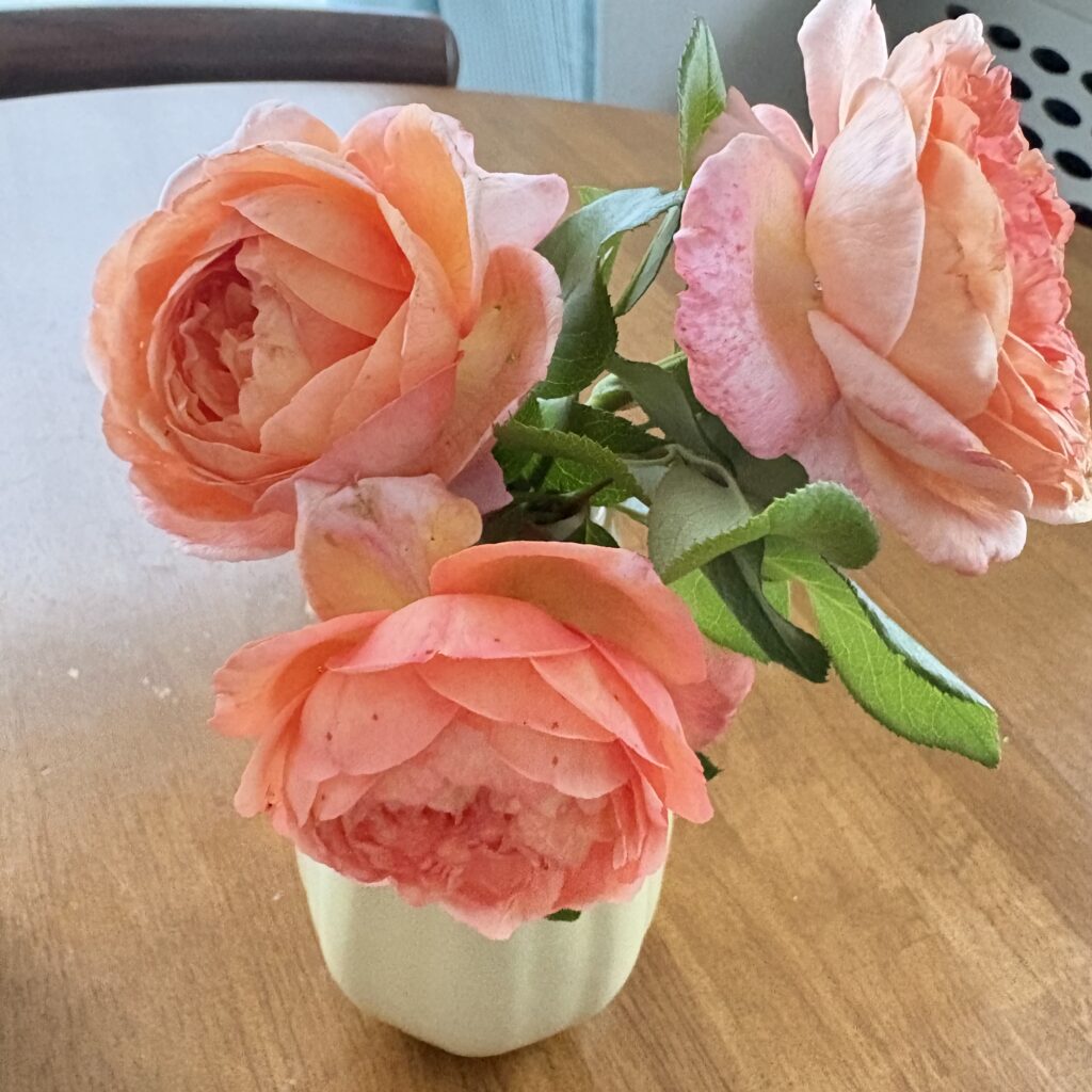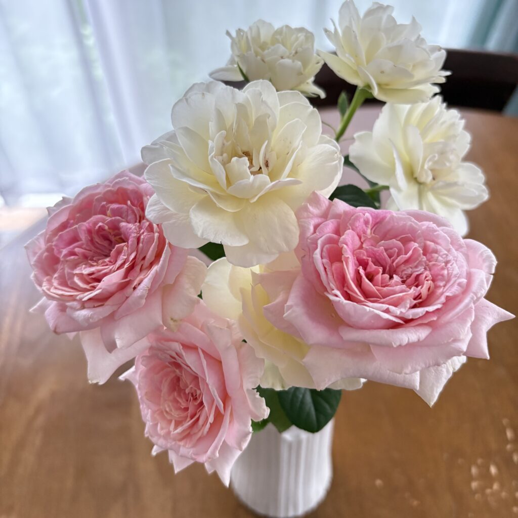 一面にバラの花が広がる庭には、もう少し時間が掛かるけど、いつかはもっと大きな花瓶に