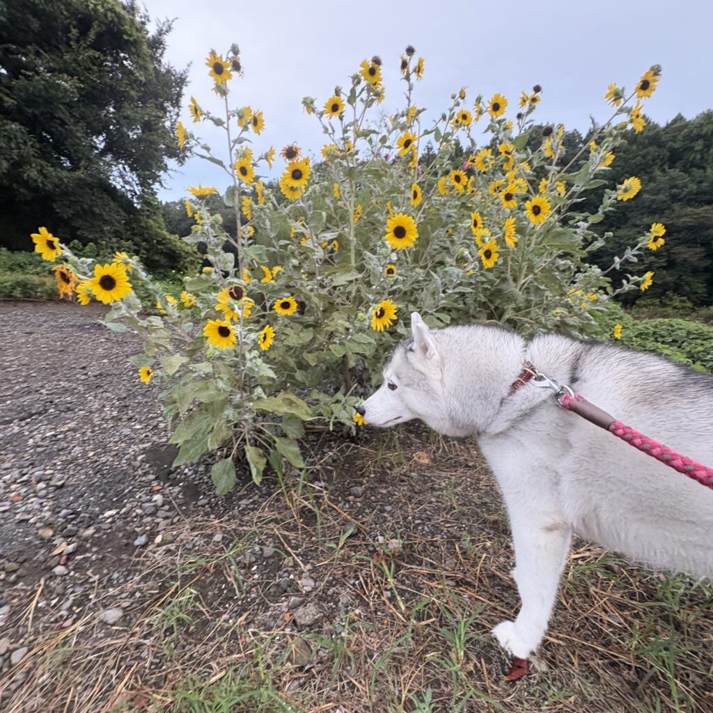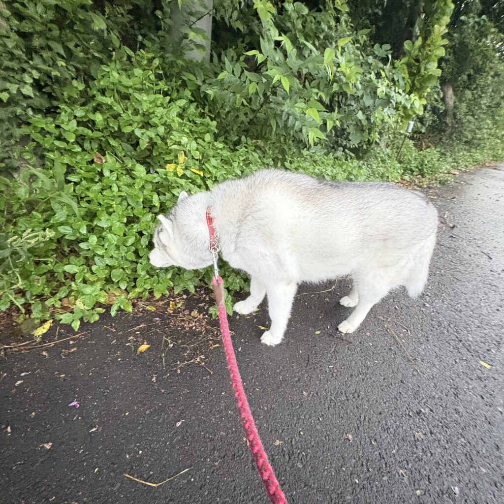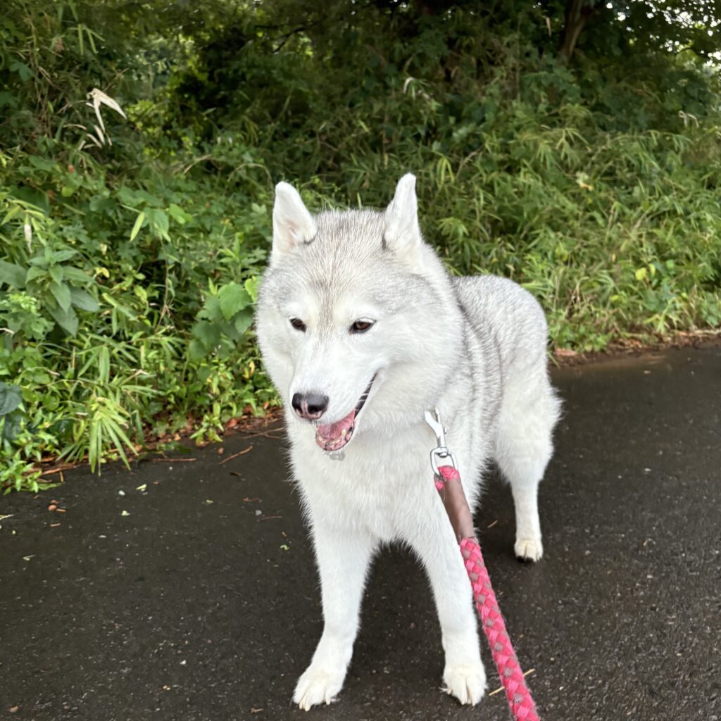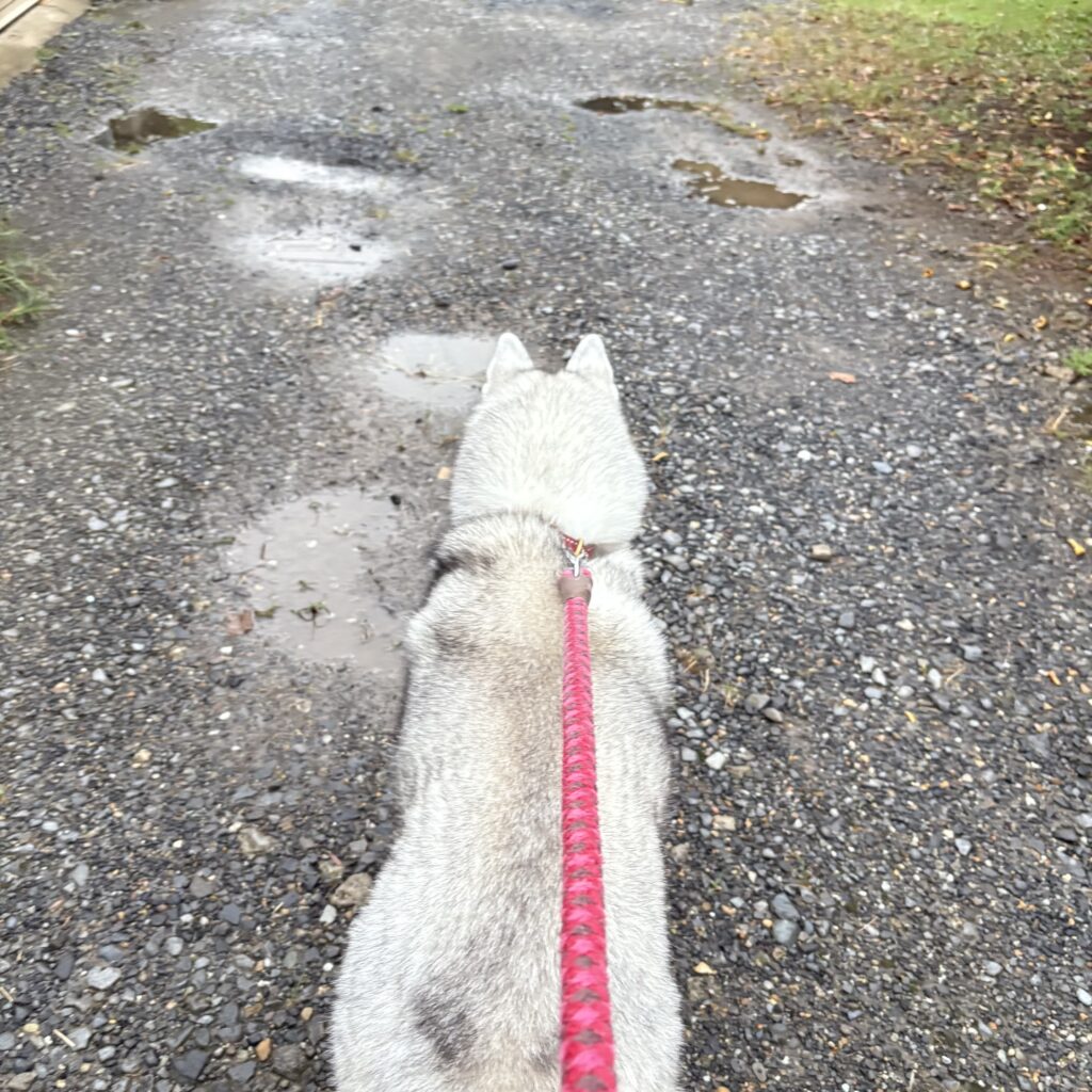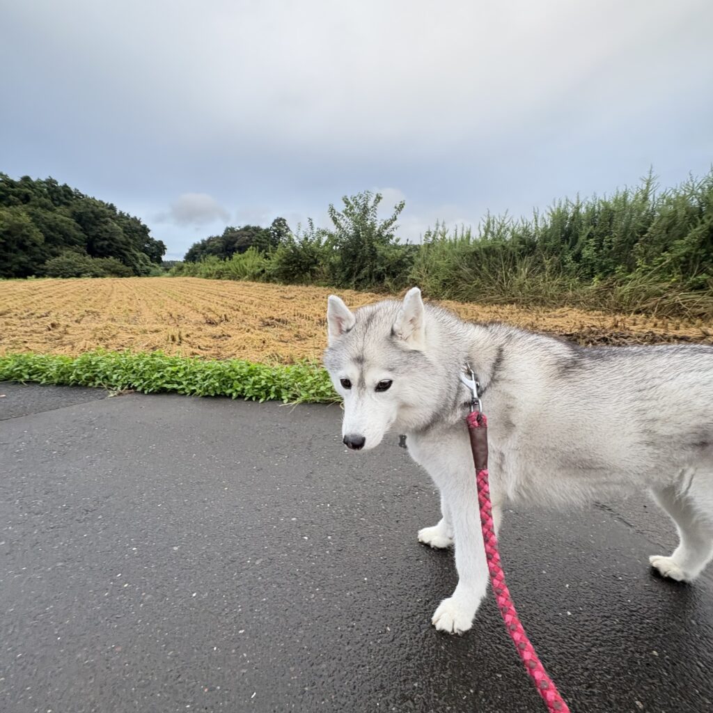 シベリアンハスキー ランの日々 🐾56 2025.09.19 涼しい!! 昨日の激しい雷雨が夏を持って行ってくれました。雨上がりの水たまりは残っていたけど涼しい朝散歩が出来ました。 稲刈りがいつの間にか済んでいて、いよいよ秋の到来という感じです。 涼しくてランもご機嫌です。やっぱり秋は良いよねぇ👍