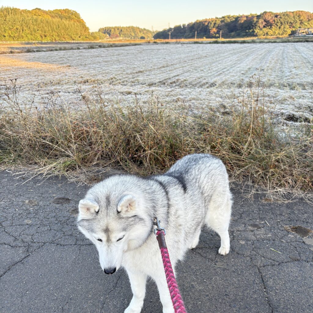 今朝は気温がいちだんと下がって田んぼに霜が降りていて真っ白。