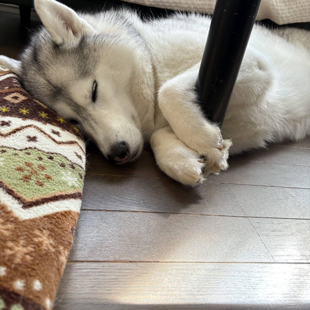 テーブルの脚に両手を揃えて寝るこの姿はランが満足している表れです😊