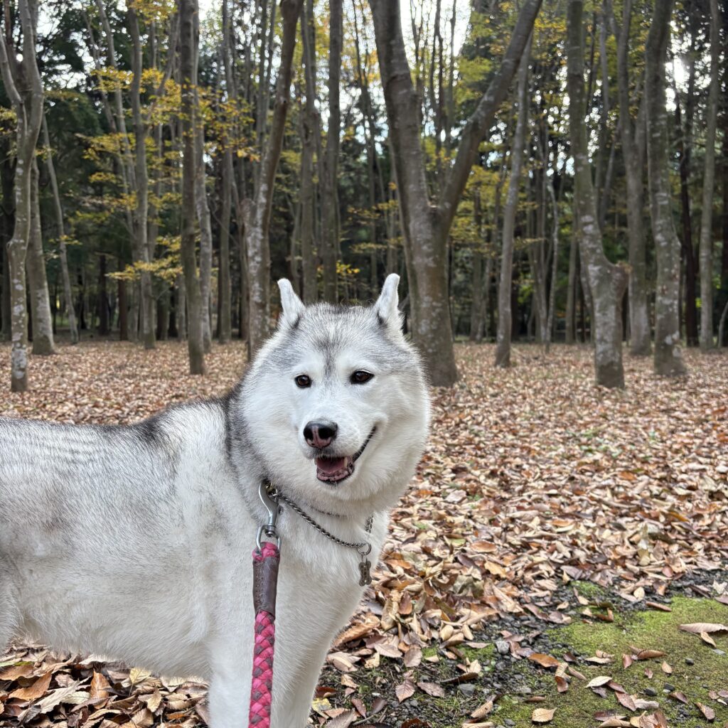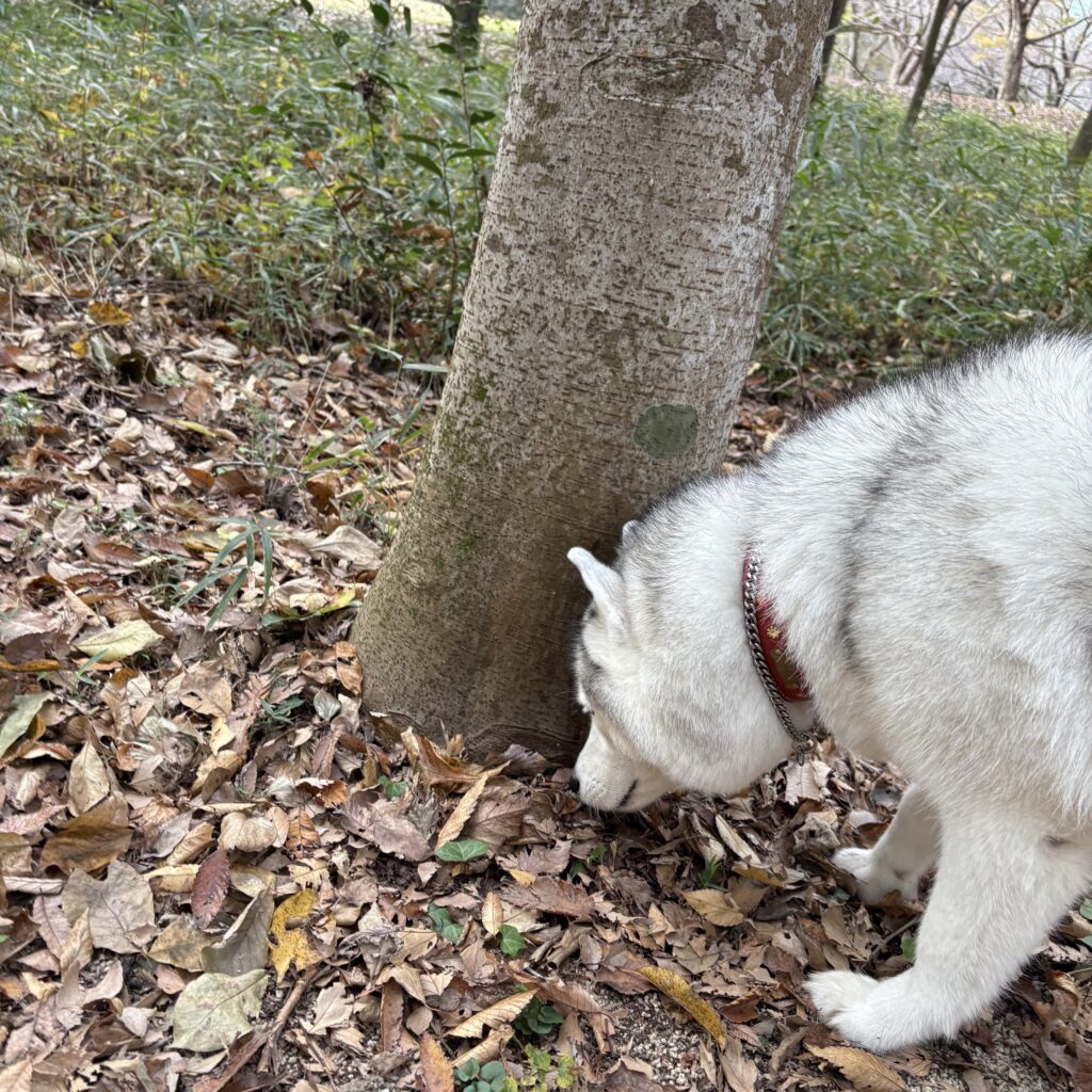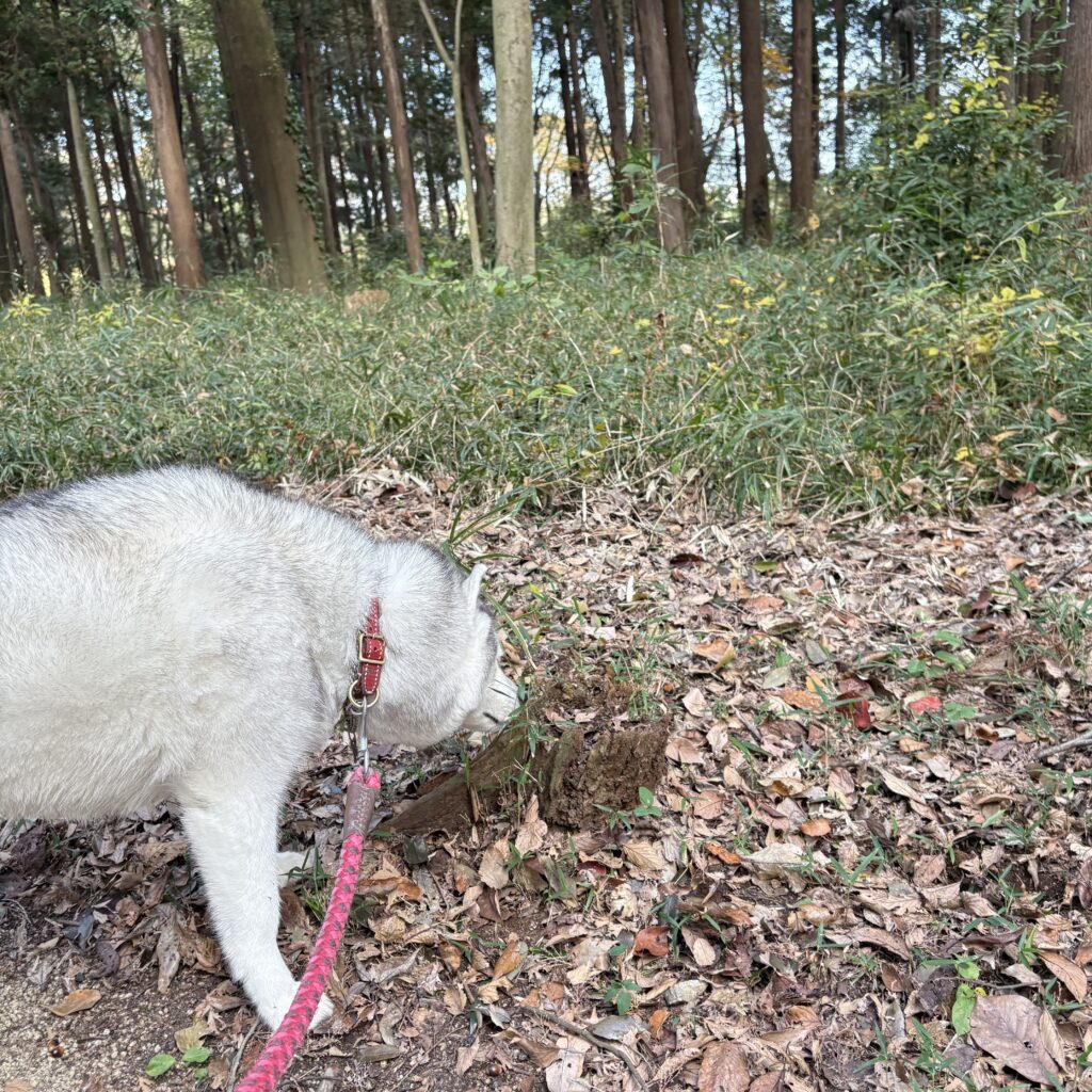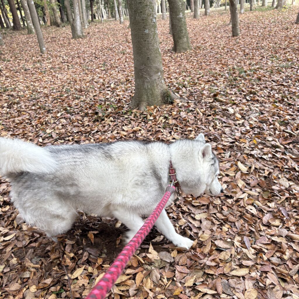 落ち葉が一面に積もった場所で、落ち葉ふみふみ、蹴散らかしと
