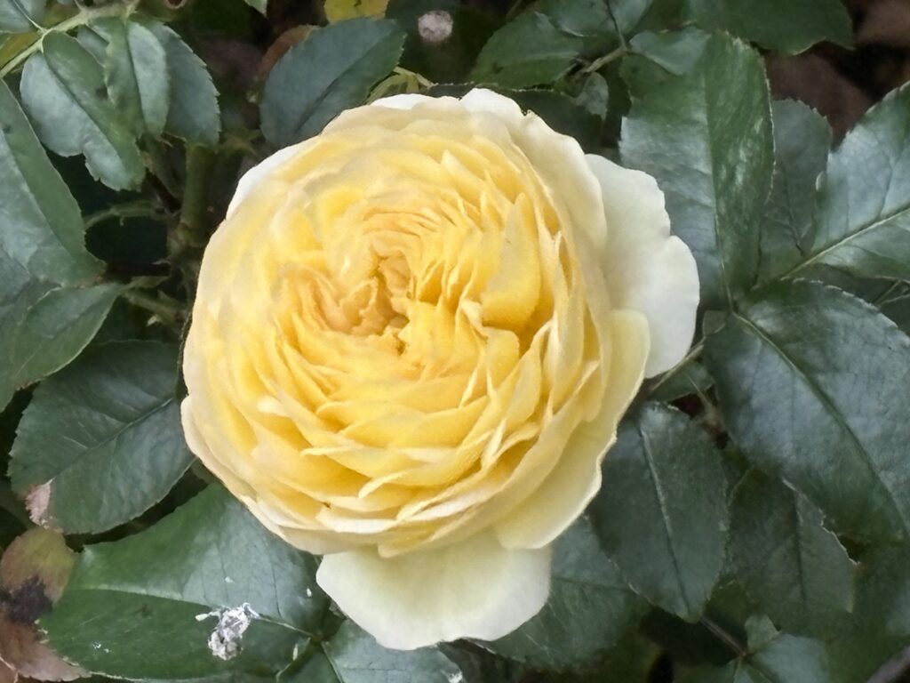 ロサ・オリエンティスのレテです。周りに背の高いバラに囲まれていますが、黄色いロゼット咲きの