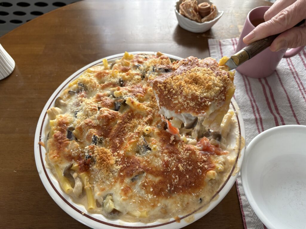 大皿いっぱいにマカロニグラタンを作ってもらいました。ベシャメルソースとチーズに埋もれるマカロニにトマトが最高です。美味しかったです😄