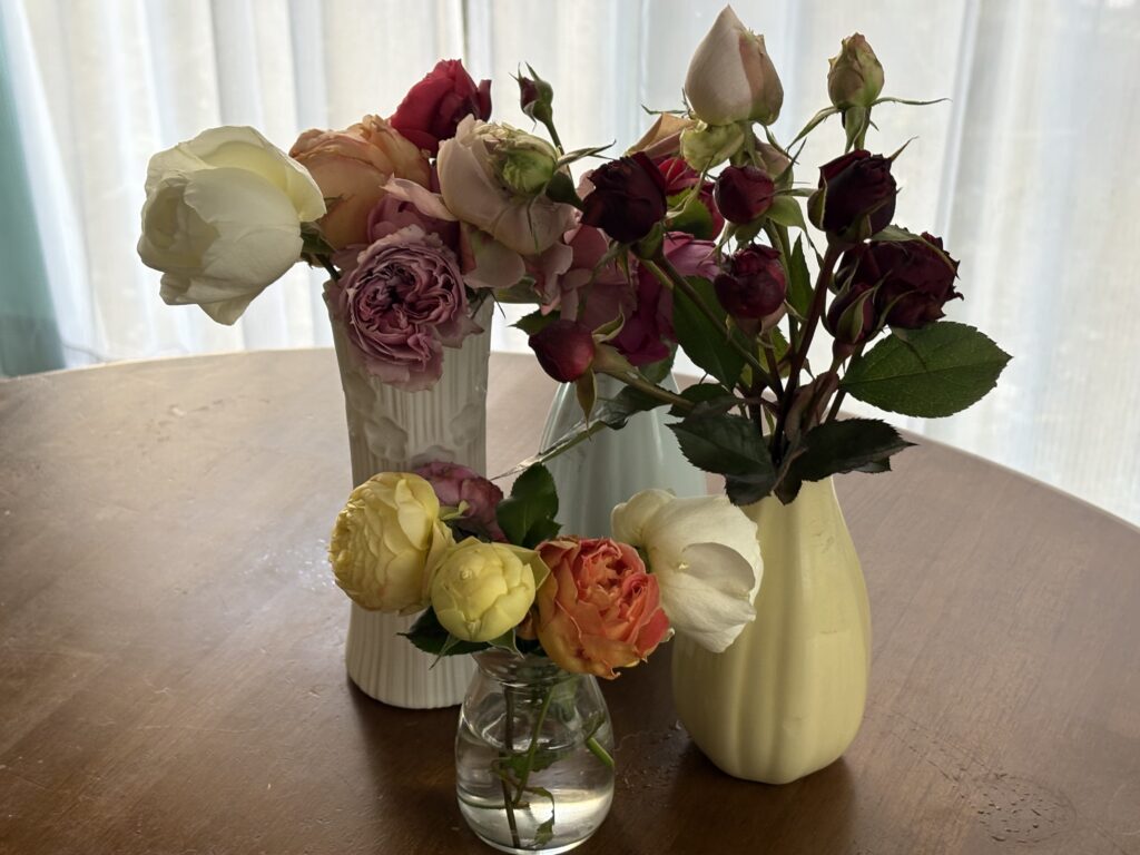 いよいよ庭にも花が無くなり、このテーブルに飾るのが2025秋バラの最後となりそうです。