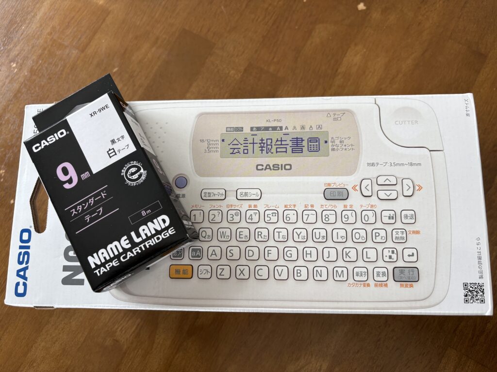 特段珍しい製品ではありませんが我が家では初お目見えです。これでじゃんじゃんネームシールを作ります。付属の9ミリのテープでは細いので倍の18ミリと別途ACアダプターも一緒に注文しました。