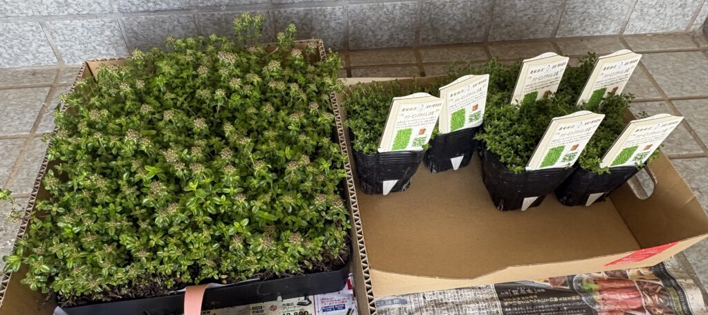 そうそう先日買ったクリーピングタイムは1シート(ポット売りで9個分ぐらいかな)で買ったので全部がピンクの花色です。グランドカバーにするので花色はなんでも構わないのだけど、せっかくなので白のクリーピングタイムがハーブコーナーに残っていたので全部買って来ました。全部って言っても6ポットですが。
